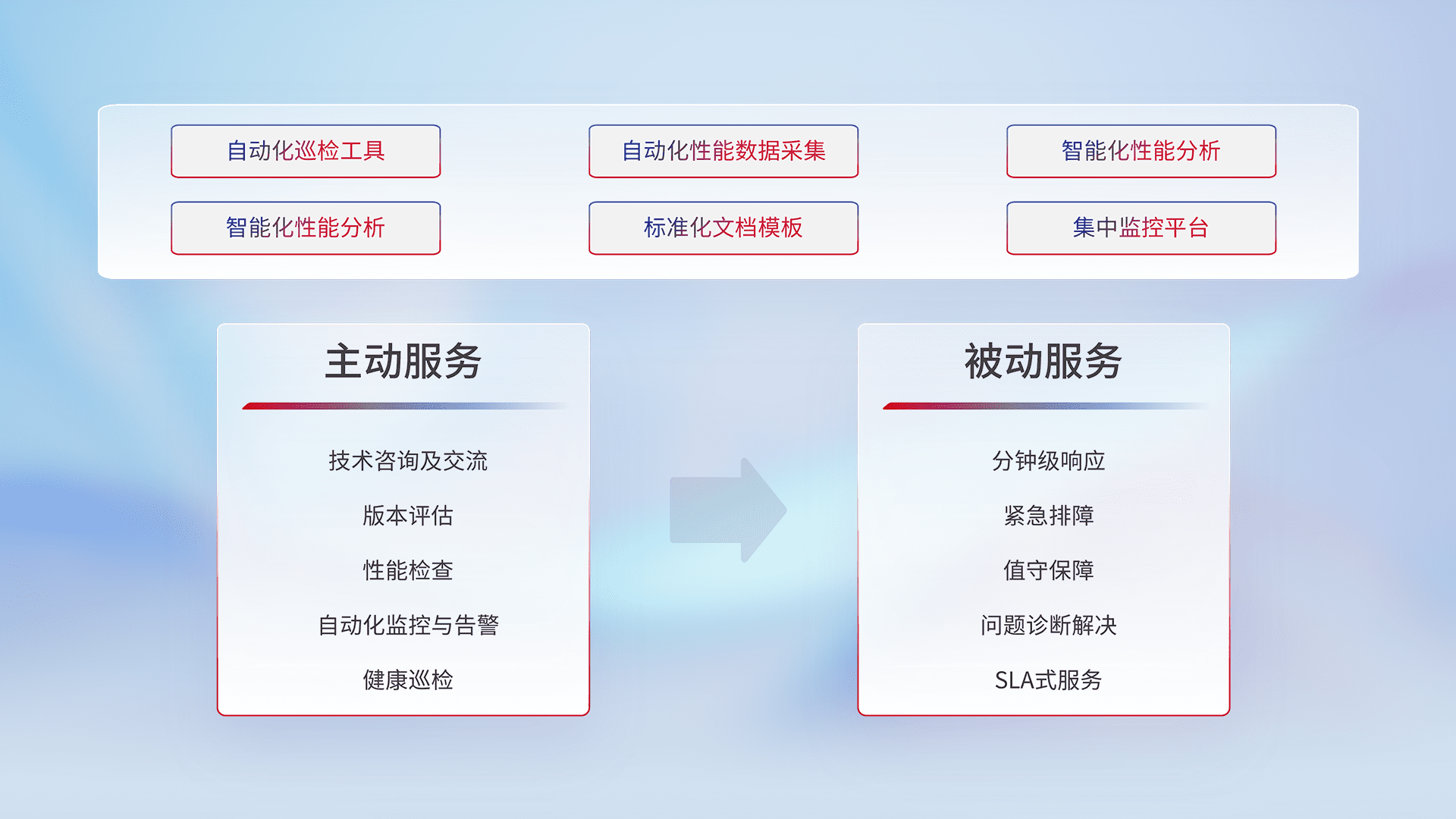 智能化工具和标准化文档,,,保障服务质量,,提供主动服务(包含技术咨询、、、、版本评估、、性能检查、、自动化监控与告警、、、健康巡检)和被动服务包含(分钟级响应、、、、紧急排障、、、值守保障、、问题诊断解决、、、、SLA服务)。。